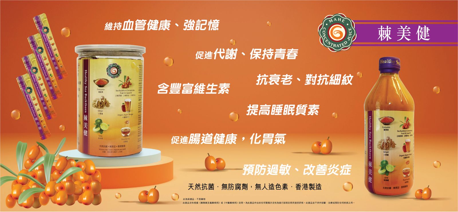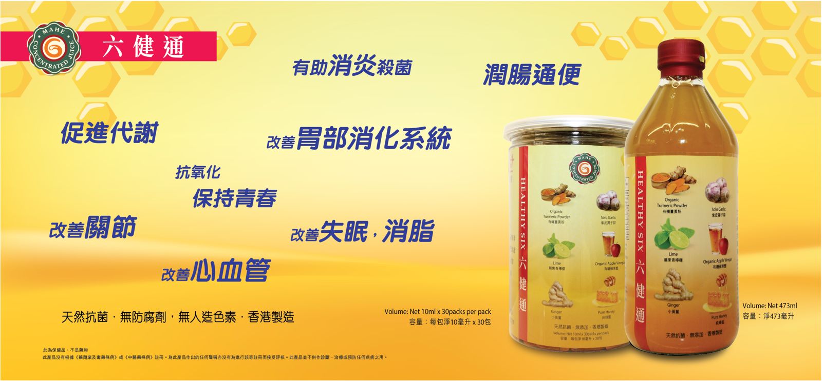 其下產品「六健通」和「保健通」由六種天然蔬果煉製而成,無防腐劑及人造色素;有通血管、預防三高、流感症狀,抑制幽門螺旋菌,調理腸胃防便秘等功效。